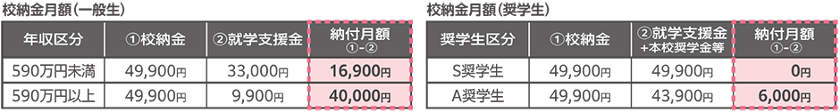 現在就学支援金を年額457,000円に増額することが検討されています。正式に決定されますと、一般生の納付月額は年収にかかわらず約11,900円となる見込みです。なお、S・A奨学生の納付月額に変更はありません。